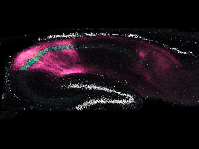 Per a construir la complexa xarxa del cervell, les neurones es guien per proteïnes de la superfície cel·lular, unint-se o repel·lint-se entre si per a establir les connexions correctes. Entre elles es troben les latrofilines, que ixen de la membrana cel·lular per entrar en contacte amb altres neurones, però també afecten processos intracel·lulars, interactuant amb molècules de senyalització anomenades proteïnes G. La latrofilina-2 és fonamental per a la formació de patrons en l'hipocamp, una zona del cervell associada a la memòria. En ratolins, els investigadors van descobrir que la latrofilina-2 intervenia tant en les neurones que feien projeccions cap a altres com en les que rebien contacte, donant forma a les connexions mitjançant interaccions repulsives amb una altra proteïna, la tenurina-3. Alterar la distribució de la latrofilina-2, expressant-la en neurones conegudes com a cèl·lules CA1 proximals (a la imatge, en turquesa), va canviar les connexions que desenvolupaven. No obstant això, les neurones projectants no resultaven alterades si també es bloquejaven les activitats intracel·lulars de la latrofilina-2, la qual cosa suggerix que la senyalització externa i interna poden estar entrellaçades. Explorar aquestes complexes interaccions podria ajudar a entendre com les connexions poden desbaratar-se en els trastorns del neurodesenvolupament.
