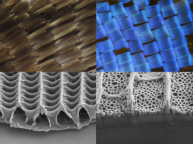 Les cometes volants i les ales de papallona són comuns en el cel d'estiu. Encara lluny de ser sols membranes boniques estirades per agafar la brisa, les ales de papallona confien en la bellesa interior per a fer front a la calor. Aquí observem escates negres i blaves d'una papallona Bistonia biston (fila superior) i baix un microscopi electrònic de rastreig (inferior). Els seus patrons estructurals ajuden a les regions de l'ala per a absorbir i distribuir calor de manera diferent, mentre les cèl·lules equipades amb sensors de temperatura que permeten a l'insecte sintonitzar la seua trajectòria de vol per protegir les seues fràgils aletes de les extremes temperatures. Dissenys econòmics que faciliten la termoregulació poden inspirar el desenvolupament de noves ales d'aeronaus, o potser el de roba "intel·ligent" per distribuir millor la calor a tot el cos, disminuint el risc d'estrés per calor quan treballem sota el sol.