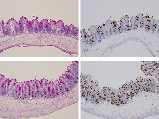 Normalment pensem en els bacteris com a ''roïns'', que causen infeccions i fent-nos malalts. Però els nostres organismes també estan plens de ''bons'' bacteris que ens ajuden a mantindre'ns sans. Mitjançant l'estudi de ratolins, els investigadors han descobert que reduint el nombre de diferents bacteris en l'intestí augmenten les possibilitats d'infeccions parasitàries greus en afectar a la producció del moc protector que normalment impedix als paràsits entrar en les cèl·lules de l'intestí. Aquestes imatges mostren seccions transversals a través de la paret de l'intestí, tenyides amb colorants rosa i marró que destaquen les cèl·lules productores de moc. Els animals mostrejats en els dos panells superiors van ser tractats amb antibiòtics per matar alguns dels seus bacteris intestinals. Aquests tenen moltes menys cèl·lules productores de moc que els animals no tractats (panells inferiors) i són més susceptibles a capturar Entamoeba histolytica –el paràsit que causa l'amebosi. Si aquesta lluita també ocorre als intestins humans, aleshores l'augment de bacteris podria ser una forma de protecció contra els paràsits.