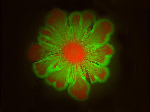 Des de galàxies en espiral fins a bacteris microscòpics, hi ha molt per aprendre en els patrons de la natura. Aquesta forma semblant a les flors, emergeix a mesura que dos tipus de bacteris creixen un al costat de l'altre en una placa d'agar. Mentre A. baylyi (roig) es mou o "migra" cap a fora, la comparativament inactiva E. coli (verd) "al cavallet" dels seus veïns mòbils, subjectant-los amb forces de fricció que donen a la colònia dels seus pètals de llaç. Els científics han desenvolupat models matemàtics per simular aquestes forces, recreant virtualment aquestes floracions. En el futur, aquestes podrien predir com colònies amb barreges de diferents bacteris podrien créixer i desenvolupar-se al món real, la construcció de biofilms a la placa dental o rastrejant implants mèdics com els marcapassos, per exemple. Aprenent com aquests bacteris interactuen podria ser un pas cap al desgranament dels seus patrons.