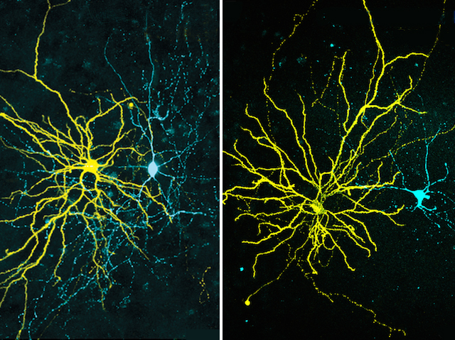 A primera vista, sembla que hi ha poca diferència entre aquestes dues imatges. Ambdues contenen neurones del ratolí d'una part especial del cervell anomenada amígdala, que es considera important per a la formació de memòries emocionals. I ambdues mostren una neurona principal extensa (un tipus de neurona, ressaltada en color groc), que connecta amb una cèl·lula de cistella de color blau –un altre tipus de neurona. Però aquí és on la semblança acaba. L'anàlisi detallada ha revelat que en realitat són dos tipus diferents de cèl·lules de cistella del cervell. Un d'ells (a l'esquerra) sintetitza una molècula anomenada parvalbúmina, mentre que l'altra fa colecistocinina. Cada tipus forma un circuit independent de neurones en el cervell que es comporten de forma molt diferent, suggerint que tenen funcions diferents en l'amígdala. Separar aquestes xarxes complexes és una feina difícil, però ens ajuda a comprendre com funcionen els nostres cervells i com es fan els records.