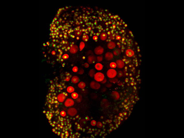 Les dones naixen amb òvuls immadurs anomenats oòcits, que maduren més endavant en la vida, un en cada cicle menstrual, preparats per ser fecundats. Aquest ovari de ratolí mostra els seus propis preciosos oòcits, artificialment tenyits de roig i amb els nuclis grocs. Desafortunadament, els oòcits sovint es danyen quan el càncer es tracta amb quimioteràpia, deixant a moltes dones infèrtils. Però hi ha esperança. La quimioteràpia sovint funciona fent que les cèl·lules canceroses s'autodestruisquen, i els científics van trobar que una cosa semblant estava passant en els oòcits com a efecte secundari. En general, una proteïna anomenada CHK2 només s'activa en els oòcits amb ADN danyat, per evitar que aquests siguen fecundats, però la quimioteràpia fa que s'active també en tots els sans. En bloquejar temporalment CHK2 amb un fàrmac, els investigadors van salvar els oòcits més petits sans del ratolí (com els de la part inferior esquerra) que d'altra manera haurien mort. En el futur, es podran oferir fàrmacs similars a les dones que pateixen càncer, potser proporcionant l'esperança d'una nova família després de la seua recuperació.
