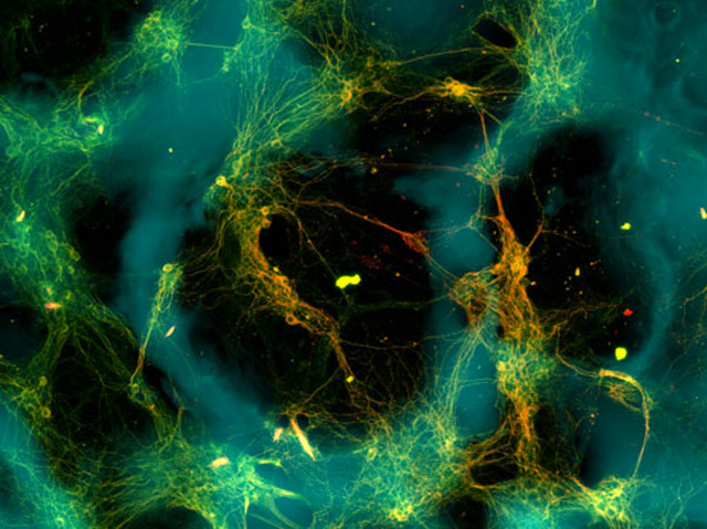 El cervell humà encara encobreix molts misteris, i els mecanismes no revelats d'aquest intricat òrgan és un repte científic important. Un dels mitjans per abordar el problema és construir sistemes artificials basats en teixits nerviosos per tal d'ajudar a modelitzar les respostes cerebrals davant diverses situacions d'estrès. La imatge és un exemple recent, basat en una bastida de col·lagen i fil de seda (color blau) dintre de la qual s'han fixat neurones de rata (en color taronja), s'han expandit i connectat entre si. El llançament d'objectes sobre aquesta estructura, tot imitant un cop al crani, demostrà que aquest cervell de bioenginyeria respon d'una manera similar al dels pacients humans lesionats; això suggereix que podria ser un sistema útil per a estudiar els efectes de la lesió traumàtica cerebral. Incrementar la complexitat del model, tot afegint diversos tipus de cèl·lules del cervell, ajudarà a desenvolupar eines sempre millors per a investigar el comportament del nostre òrgan més intrigant.