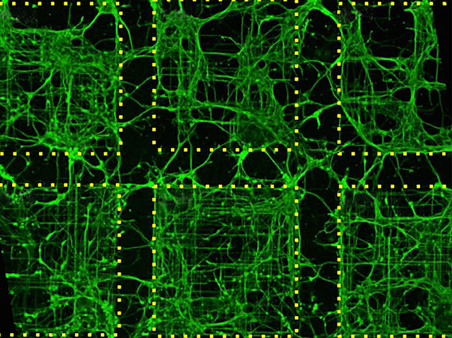 Les plantes enfiladises sovint s’enrotllen elles mateixes al voltant d'estructures properes per subjectar-se. Fins i tot, poden ser entrenades per florir en formes específiques. Aquest fullam és molt més petit que els dels jardins mitjans – xarxes de neurones de rata acolorides amb fluorescència verda, cadascuna és 10.000 vegades més primes que una tija de clematis. A la fotografia de dalt, les neurones creixen al llarg de petits suports de pilars artificials anomenats nanocables; cada suport està marcat amb punts grocs. Els nanocables tenen diferents distancies en cada suport, provant fins a quin punt les cèl·lules estan disposades a créixer per connectar-se amb les neurones veïnes. Aquestes xarxes artificials estan prosperant amb impulsos nerviosos –augmentant les esperances per al desenvolupament d'implants neuroprotètics, que creixen per tapar forats en el sistema nerviós humà.