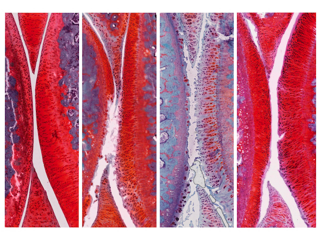 L'artrosi, que afecta els ossos a les articulacions que els fan rígids i dolorosos, té lloc quan el cartílag llis i elàstic que es troba protegint els extrems dels ossos es trenca. La deterioració pot aparéixer per lesions, o desgast, però de qualsevol manera hi ha pocs tractaments disponibles a part de l'alleujament del dolor o de la cirurgia. En la cerca de nous medicaments, els investigadors han trobat dues molècules que semblen protegir i renovar les cèl·lules cartilaginoses. De fet, quan s’injecten juntes als genolls de les rates amb artrosi, les molècules van augmentar l'amortiment del cartílag. El panell superior de dalt mostra el genoll sa d'una rata amb un cartílag gruixut i llis cartílag (blanc). El segon mostra la fase 2 de l'artrosi, el tercer, mostra el procés fins a la fase 4. I l'últim panel mostra la fase 2 d'un genoll després de la teràpia combinada amb clares millores del cartílag. Si aquests resultats poden ser recapitulats en humans, de segur que suposarà un pas al davant per les persones que pateixen d'artrosi a tot arreu.