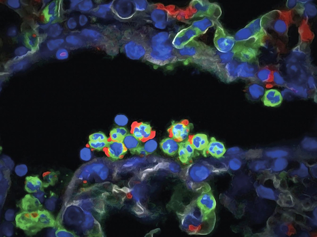 Les cèl·lules del sistema immunitari que reaccionen primer es desarmen espontàniament després d'unes hores d'haver sigut utilitzades per a lluitar contra la infecció. Açò manté el sistema immunitari en revisió i impedeix que danye teixit sa. Estes cèl·lules, anomenades neutròfils, contenen un armament defensiu de proteïnes altament tòxiques i poden formar estructures tipus trampa. Totes juntes, estes proteïnes i trampes tenen com a objectiu destruir els bacteris invasors, però també poden danyar teixit sa, particularment en els pulmons. És sabut que la sobreactivitat del sistema immunitari pot jugar un rol clau en malalties del càncer, cor i neurodegeneratives. Nous descobriments mostren que estes proteïnes dels neutròfils s'emmagatzemen gradualment fins a esgotar-se, i les cèl·lules perden la seua habilitat per a crear trampes. Este mecanisme integral manté els nivells d'inflamació sota control i protegeix teixit vulnerable. Ací, els neutròfils (en verd) estan penetrant el teixit pulmonar d'un ratolí infectat. S'ha mostrat que este mecanisme ocorre també en cèl·lules humanes i pacients amb pneumònia.