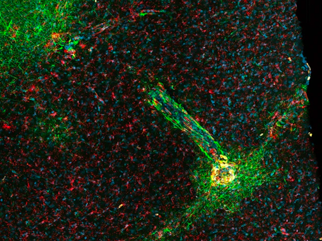 És l'any 1947, a Uganda, i un mico anomenat 766 que viu a l'Institut d'Investigació de la Febre Groga, està malalt amb febre. Té una infecció desconeguda, que prompte els investigadors anomenaran virus del Zika (VZIK). Avancem ràpidament fins al 2015 i una epidèmia de VZIK s'ha consolidat a les Amèriques, fent que els fetus de dones embarassades infectades patisquen danys cerebrals i desenvolupen cervells més petits del normal (microcefàlia). Els investigadors ara indaguen sobre els efectes de la infecció per VZIK en el cervell fetal dels micos rhesus. La microscòpia de fluorescència del cervell fetal (a la foto) va revelar signes d'inflamació a les regions infectades, específicament un gran nombre de cèl·lules immunitàries anomenades micròglia activada (roig), així com un augment de la mort cel·lular de neurones immadures juntament amb un augment dels marcadors de fagocitosi (taronja), un procés que es produïx per eliminar les cèl·lules mortes. Això revela que la inflamació probablement juga un paper important a l'hora de pertorbar el desenvolupament cerebral dels fetus infectats amb VZIK .