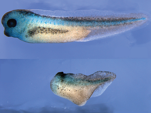 És important saber què és què –o més àmpliament, ser capaç de distingir el davant del darrere, el cap de la cua o l’esquerra de la dreta. Però mentre aquesta habilitat és bastant útil quan ens vestim als matins, és absolutament vital per a crear un embrió durant les etapes inicials de la vida. El capgròs a la fotografia superior és un individu juvenil sa i normal de l’espècie de granotes Xenopus laevis, estudiada sovint com a un model útil per al desenvolupament primerenc. L’animal desafortunat de la fotografia inferior manca d’una molècula anomenada Gen 1 relacionat amb Brahma (Brg1), que ajuda a organitzar l’ADN i els gens dintre de les cèl·lules de l’embrió. Sense aquest gen, l’embrió no pot distingir on hauria d’estar el seu extrem frontal i no aconseguix formar el cap. Els embrions de granota com aquest estan ajudant els científics a entendre els processos inicials del desenvolupament, aclarint com altres animals – inclosos els embrions humans– saben què és què al seu organisme.