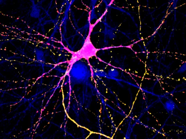 Els cannabinoides, els compostos farmacològicament actius del cannabis, imiten els propis endocannabinoides del cervell - molècules que influencien en funcions cerebrals com l'estat d'ànim, apetit, dolor i memòria. Aquesta imitació explica l'excitació que provoca la droga i els seus efectes mèdics potencials. Però es necessita una comprensió més completa del mecanisme de la droga per crear noves teràpies que proporcionen més beneficis amb menys efectes secundaris. Amb aquesta finalitat, alguns investigadors estant centrant la seua atenció en l'objectiu biològic de la droga: el receptor de cannabinoides, trobat a la superfície de les cèl·lules cerebrals. S'ha descobert, per exemple, que en neurones (com la fotografiada) els receptors estan restringits als axons de la cèl·lula (de color groc) -projeccions que envien senyals elèctrics a altres neurones- i estan absents a les dendrites (de color rosa), les quals reben els senyals. Determinar com es produïx i distribuïx, el receptor, a la cèl·lula i com afecta açó a l'acció de dels cannabinoides podria guiar la creació de millors teràpies dirigides a base de cannabinoides.