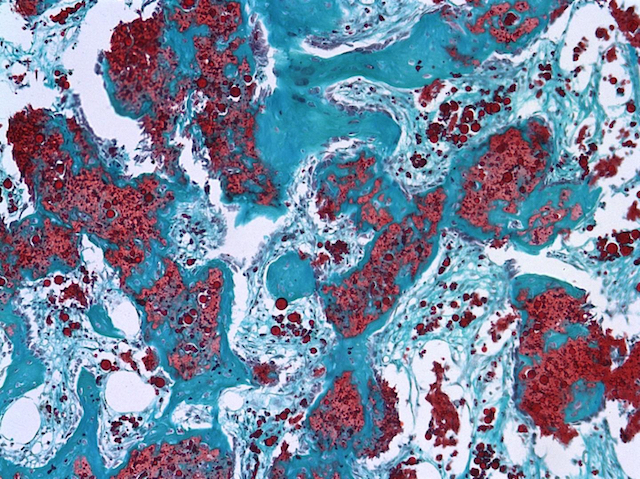 La proteïna morfogènica òssia (BMP-2) s'utilitza habitualment per a facilitar la reparació òssia en grans fractures en augmentar la producció òssia. Les grans dosis requerides, però, causen problemes, especialment el creixement no desitjat d'os en teixits propers. S'han utilitzat diversos mètodes per restringir la BMP-2 a zones específiques, com unir-la a una bastida de col·lagen o incrustar-la en biomaterials amb proteïnes que s'uneixen a BMP-2, però presenten un èxit limitat, ja que és difícil assolir l'equilibri adequat d'alliberament i restricció. Actualment, els investigadors hi han proposat una nova tècnica, que consisteix en unir la BMP-2 a micropartícules d'heparina, un polisacàrid que sovint s'utilitza com a diluent de la sang o anticoagulant. Les proves sobre defectes ossis al fèmur de rates (a la imatge, les partícules d’heparina de color roig), van trobar que el creixement ossi es restringia millor a la zona correcta quan s’utilitzaven micropartícules d’heparina. Tot i que cal abordar altres problemes, aquest mètode podria obrir un camí prometedor cap a una reparació òssia més específica.