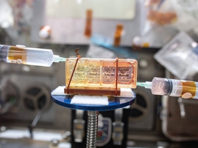 Les cèl·lules mare representen grans esperances en la medicina, ja que poden convertir-se en una gran varietat de diferents tipus de cèl·lules. Investigadors dels laboratoris de tot el món estan estudiant la biologia d'aquestes cèl·lules especialitzades i provant maneres de convertir-les, per exemple, en cèl·lules cardíaques per tractar les afeccions del cor. Tot açò són expectatives, però un obstacle important que impedix que aquestes teràpies siguen més comunes és la producció eficaç de grans quantitats de cèl·lules per utilitzar. Una possible solució per a açò es viatjar a uns 400 km per damunt de nosaltres, a l'Estació Espacial Internacional. Aquest laboratori únic permet als astronautes realitzar experiments en microgravetat, i aquestes condicions properes a la gravetat zero poden ser la resposta a la producció ràpida de cèl·lules mare per a la medicina regenerativa. Els astronautes també estan treballant en projectes per dissenyar productes a partir de cèl·lules mare, com el teixit cardíac (imatge) i crear models de malalties que podrien representar una ruta per al futur desenvolupament de la biomanufactura, aportant-los noves maneres per viure de forma més saludable.