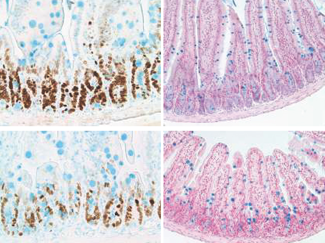 Les cèl·lules que recobrixen els nostres intestins s'han de substituir cada cinc dies perquè puguem continuar absorbint tots els nutrients dels nostres aliments. Les cèl·lules mare intestinals són les responsables d'aquesta substitució. Es troben a la base de les vellositats, que són les estructures, semblants a uns dits, que es veuen a la columna de la dreta en aquestes seccions especialment tenyides d'intestí de ratolí. A mesura que les cèl·lules mare es dividixen, espenten lentament les noves cèl·lules cap amunt, com una cinta transportadora, substituint les velles per unes de més noves. Per a un intestí sa, és fonamental que es mantinga aquesta població de cèl·lules mare. MLL1 és una proteïna necessària per a aquest manteniment. Sense ella (part inferior de la imatge), les cèl·lules mare no es poden dividir de manera tan eficient, com mostra la tinció marró, la qual cosa conduïx a una reducció de les cèl·lules caliciformes (tinció blava a la columna dreta) que són un lloc principal per a la digestió dels nutrients. Això conduïx ràpidament a una insuficiència intestinal.