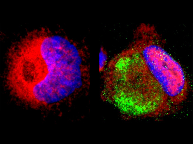 Quan el virus del Zika travessa la placenta per infectar el fetus en dones embarassades, ataca la vida abans que tinga temps d'establir-se, com si s'esclafara una llavor abans de plantar-se. En particular, el virus afecta cèl·lules primerenques del sistema nerviós, les cèl·lules progenitores neurals, i causen així un ampli rang de problemes en el desenvolupament. Per investigar com ocorren aquests impactes, els investigadors han examinat aquestes cèl·lules al laboratori centrant-se en una proteïna anomenada UPF1, la qual actua sobre l'ARNm (transcripcions dels gens que s'estan expressant). Les cèl·lules infectades tenen menys UPF1 i els investigadors han vist que com a resultat, els productes de transcripció (en roig) s'embossen al nucli cel·lular (en blau) a les cèl·lules infectades amb Zika (en verd, a la dreta), comparat amb les que no estan infectades (a l'esquerra). Açò reduïx la producció de les proteïnes d'aquests transcrits, com una anomenada FREM2, la qual és necessària per a mantindre i determinar la identitat de les cèl·lules progenitores neurals, i d'aquesta manera, impedix el desenvolupament des d'un principi.