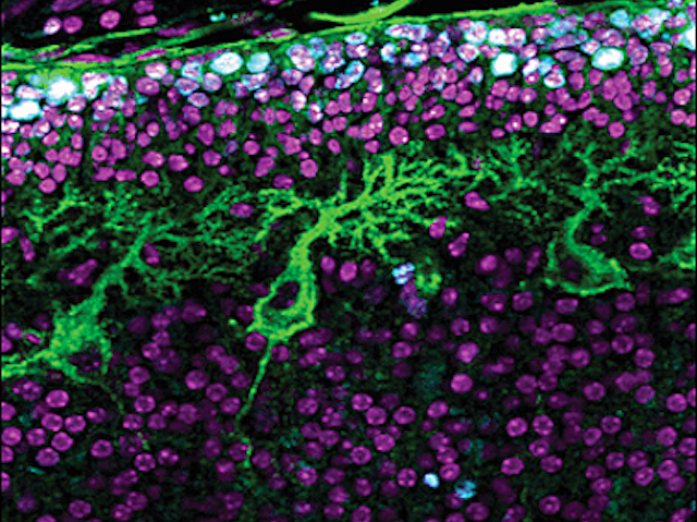 Les diferents àrees del nostre cervell estan unides per xarxes de connexions ben sintonitzades i coordinades. Localitzat a la part posterior del cervell, trobem el cerebel, conegut per la seua tasca de coordinador dels nostres moviments, però, a més, una sèrie d'estudis han relacionat les xarxes cerebel·loses pertorbades amb trastorns del desenvolupament com l'autisme. Recentment, els investigadors s'han proposat entendre millor aquesta relació, centrant-se en les cèl·lules de Purkinje, neurones que només es troben al cerebel i que tenen un paper vital en el seu funcionament. L'equip va comprovar que l'absència de la proteïna anomenada receptor de neurotrofina p75 en els ratolins va desencadenar una cascada d'efectes; en primer lloc va pertorbar el cicle cel·lular (el procés de divisió) de les neurones que proporcionen l'entrada de les cèl·lules de Purkinje (a la imatge es veuen, en un ratolí jove, de color verd), que al seu torn va afectar el funcionament d'aquestes cèl·lules, i finalment, aquesta pertorbació va derivar en un dèficit d'aprenentatge que va continuar a l'edat adulta. Aquests resultats ens mostren com els errors aparentment menors en els nostres circuits cerebrals coordinats, poden tenir repercussions generalitzades.