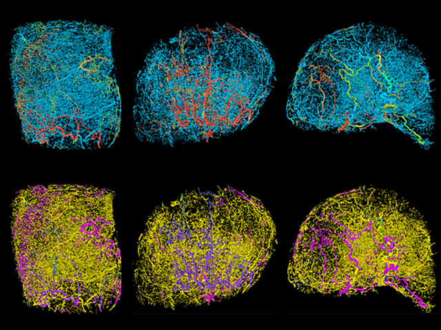 Un dels obstacles a l'hora de curar el càncer és el fet que forma part d'un cos viu que el manté (sovint alguns vasos sanguinis s'estenen fins a arribar a alimentar el teixit cancerós, en un procés anomenat angiogènesi). A més, de la mateixa manera que els nostres organismes es desenvolupen de manera diferent, així ho fan els tumors, complicant el disseny de fàrmacs o procediments quirúrgics. Una nova combinació de microscopia de ressonància magnètica en 3D i modelització per ordinador investiga les diferències, o heterogeneïtat, de tres tumors de mama en desenvolupament en ratolins. La fila superior ressalta diferents patrons de vasos sanguinis en tipus similars de càncer, amb regions on la sang flueix ràpidament ressaltades en colors càlids. Davall, en roses i porpres mostren els nivells d'oxigen corresponents en el subministrament de sang. Aprendre més sobre l'hemodinàmica de diferents tumors pot revelar més sobre allò que tenen en comú, creant una mena d'Atles del càncer i identificant punts dèbils que serviran per a futurs tractaments.