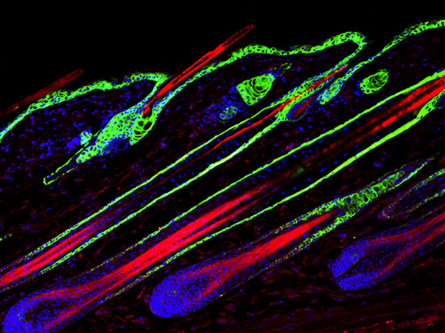 Des d'un floc de cabell del teu cap fins el pèl dels dits dels peus, tots els cabells del teu cos creixen en petites cavitat anomenades fol·licles – vistes ací en un tall prim de pell sota un microscopi de fluorescència. Cada fol·licle treballa en cicles, creixen per uns quants anys, després es detenen i moren en unes poques setmanes. Normalment quan un cabell cau, altre nou creix i ocupa el seu lloc. Però en alguns casos, com en l'alopècia androgènica, açò no ocorre, i els investigadors estan estudiant els components biològics subjacents per tal de trobar pistes que ens donen un perquè. Una petita molècula coneguda com microARN [químicament semblant a l'ADN] s'activa quan el cabell para de créixer, i podria ser important per controlar el procés. Quasi dos terços de la població pateixen pèrdua de cabell en algun moment de la seua vida, per tant aquest descobriment pot conduir a nous tractaments per parar-la o revertir-la.