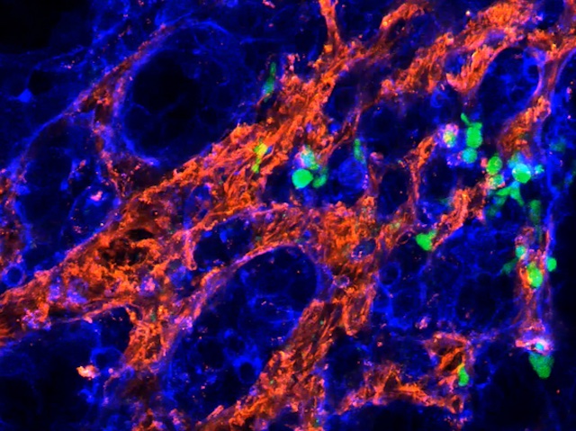 Dur a terme un moviment hàbil al camp d'entrenament és una cosa, però fer-ho durant un partit important és una altra. I que els tractaments funcionen en els experiments de laboratori no significa que vagen a ser eficaços en l'organisme. Els investigadors saben que limfòcits T gamma delta (un tipus de cèl·lula immunitària, en verd) tenen el potencial de combatre el càncer (en blau), localitzant les cèl·lules tumorals que produïxen senyals induïts per l'estrés. No obstant això, el càncer de mama triple negatiu empra un conjunt de cèl·lules mare canceroses per eludir a aquestes cèl·lules immunitàries. En proves de laboratori, els limfòcits T de donants sans van ser capaços de dirigir-se a aquestes cèl·lules mare, però quan els investigadors van repetir la prova en ratolins va ser com si s'esvaïren entre la multitud, fent ineficaços els limfòcits T gamma delta. Tractar els ratolins amb àcid zoledrònic -un fàrmac ja utilitzat per a tractar l'osteoporosi- va ajudar els limfòcits T a fixar-se a les cèl·lules canceroses, la qual cosa suggerix noves estratègies d'immunoteràpia combinada per al càncer de mama triple negatiu, difícil de tractar.