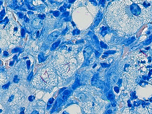 La tuberculosi (TB) afecta aproximadament a un terç de la població mundial. Set llinatges del bacteri causant, Mycobacterium tuberculosis (Mtb), estan conformats per diferents soques, que varien atenent a característiques com la sensibilitat als fàrmacs. Un estudi amb 124 pacients de TB al Brasil i els més de 700 individus amb els quals havien tingut contacte proper va subdividir el llinatge de Mtb en dues soques, alta (HT) i baixa (BT), en funció de la seua efectivitat en la transmissió de la malaltia. Ara l'equip d'estudi ha observat el mal que provoquen les dues soques en pulmons de ratolí. Les cèl·lules immunitàries anomenades macròfags, farcides de gotes de lípids, són un marcador d'infecció per Mtb. Als ratolins amb Mtb-HT es desenvoluparen grups discrets de macròfags (granulomes), que contenien menys gotes lipídiques i menys bacteris (els gargots negres del centre de la imatge) que els macròfags inflamatoris generalitzats trobats amb Mtb-LT. La manera en què el sistema immunitari interactua amb la Mtb ens porta aparentment a diferents patrons de creixement i dany bacterià, el qual al seu torn subjau les subseqüents diferències en infecciositat.