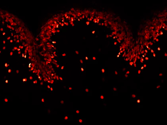 Si vos donara un tovalló bellament plegat en forma de cigne, sabríeu com es va fer? Aquest és el repte dels investigadors que intenten entendre com es formen els infinits i complexes plecs del cervell humà durant el desenvolupament. Diverses teories expliquen el seu origen. Les cèl·lules exteriors s’estiren en diferents direccions o les velocitats de creixement desigual causen les protuberàncies? Els errors en el procés de plegament poden provocar malalties greus, de manera que entendre el mecanisme, pot tenir impactes reals. Els investigadors van mirar el cerebel del ratolí: una xicoteta part del cervell i amb una perspectiva més senzilla d’abordar. Van trobar que durant les primeres etapes del plegament, les cèl·lules de la capa externa (a la imatge) creixen de manera més uniforme i ràpida respecte a les cèl·lules internes i amb flexibilitat semblant a la dels fluids. En revelar aquest fet i amb una prèvia combinació de forces desconegudes, com ara les tensions que limiten el creixement, els investigadors intenten resoldre el misteri.