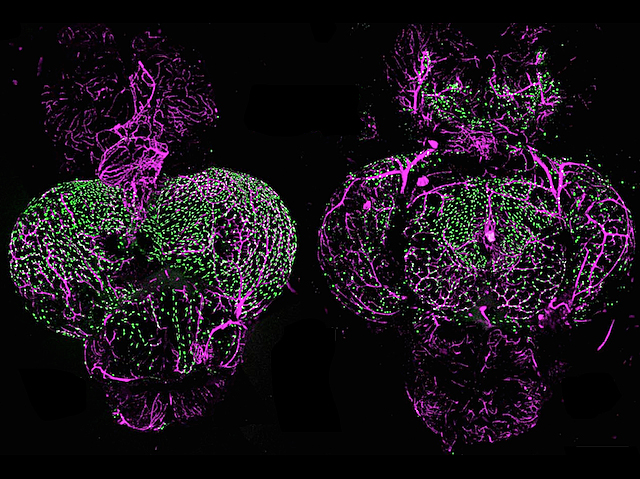Tria qualsevol ciutat capital del món i trobaràs que els edificis més fortificats sovint acullen al seu govern –el cervell que hi ha darrere el funcionament d'un país. Quan es tracta de fer funcionar el cos humà, el teu cervell està molt protegit també. Una barrera, anomenada barrera hematoencefàlica, permet que els nutrients vitals passen, mentre s'aturen les toxines nocives. Els investigadors saben que hi participen cèl·lules especials que se situen al voltant dels vasos sanguinis cerebrals. No obstant això, les funcions exactes d'aquestes cèl·lules perivasculars no estan clares. Analitzant imatges de cervells de peix zebra (en la foto), els investigadors van descobrir un grup de cèl·lules perivasculars (verd) agrupades al voltant dels vasos sanguinis (rosa) anomenades FGPs. La seua forma i localització revelen que són equivalents a les FGP que es troben en els mamífers, inclosos els humans. Els peix zebra és ideal per a jugar amb els gens i visualitzar els seus efectes, el que significa que ara tenim una eina útil per esbrinar què pot estar fent aquest grup particular de cèl·lules perivasculars.
