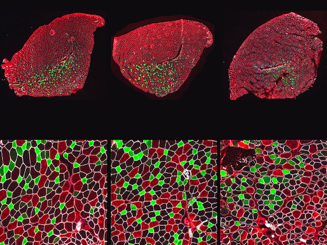 La teua sang conté fragments de cèl·lules -les plaquetes- les quals poden potenciar la reparació muscular. Per aquest motiu les injeccions de plasma enriquides en plasma s'utilitzen per a tractar ferides musculars. Uns investigadors estudiaven com actua mitjançant microscòpia de fluorescència sobre músculs de ratolí sans i danyats (a la imatge). Les plaquetes s'acumulen després d'una ferida i el tractament amb anticossos per eliminar-les impedia que unes cèl·lules immunitàries anomenades neutròfils s'acumularen a aquests músculs. Açò també impedia la reparació. Les plaquetes alliberen missatgers químics anomenades citocines, i els investigadors han mesurat els nivells de citocines després d'una lesió en músculs normals i en privats de plaquetes. L'esgotament de plaquetes reduïa els nivells de citocines CXCL5 i CXCL7 que atrauen neutròfils. Comparant músculs normals de ratolí (abans de lesió, a l'esquerra; 2 setmanes després, al centre de la imatge) i aquells sense CXCL7 (2 setmanes després, a la dreta), es mostra que els ratolins sense CXCL7 reclutaven menys neutròfils en una ferida i dos setmanes després tenien fibres musculars més menudes (ampliat, baix a la dreta). Les CXCL7 derivades de plaquetes, doncs, promouen la reparació de músculs via neutròfils - aquesta via podria ser explotada per millorar la reparació.
