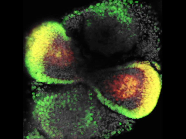 Els ulls no sempre duren tota la vida. La ceguera està relacionada amb l'edat, la degeneració de la retina i altres trastorns poden robar a una persona el plaer de la vista massa prompte. En altres casos, els trastorns del desenvolupament poden negar la visió a una persona des del primer moment. Per millorar la comprensió del desenvolupament de la retina, la malaltia i la regeneració, els investigadors estan ideant maneres de fer créixer el teixit en cultiu. Una d'eixes aproximacions desenvolupada recentment consisteix en cultivar complexos organoides retinians en 3D, que imiten l'organització de teixits i patrons d'expressió gènica de les retines reals, a partir de cèl·lules mares embrionàries de ratolí o humanes. Després d'una setmana en cultiu especialitzat, les cèl·lules formen camps oculars, com els dos fotografiats, i porten el rang esperat dels factors importants del desenvolupament (roig, verd i, quan es combinen, groc). I després de dues setmanes els organoides estan complets. El teixit obtingut al laboratori no només ha de donar una idea de la biologia de la retina, sinó que fins i tot pot proporcionar material de base per a les teràpies de reemplaçament cel·lular del futur.