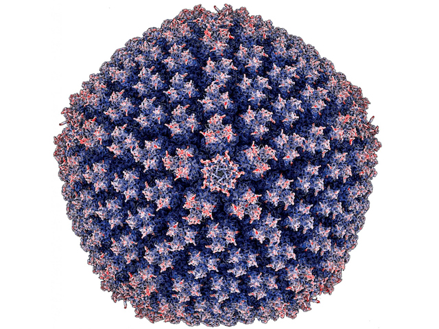 Aquesta il·lustració mostra la estructura més detallada fins ara d'un adenovirus entèric humà - una agent primari causant de diarrea i morts associades a diarrea arreu de tot el món. A diferència d'altres tipus d'adenovirus, com els que infecten les vies respiratories o aquells que han sigut dissenyats per fabricar vacunes, els enterics són capaços de suportar l'ambient altament àcid de l'estómac. Els nous detalls estructurals del virus, que van ser obtinguts mitjançant microscòpia crioelectrònica - una aproximació que proporciona una resolució de nivell quasi atòmic - revelen les característiques específiques de l'envolcall proteic del virus que proporcionen aquesta robustesa estructural. De manera emocionant, aquesta nova visió no només pot ajudar a explicar com el virus sobreviu a les dures condicions de l'estómac i infecta les cèl·lules intestinals, sinó que també obri la porta al desenvolupament de vacunes igual de robustes basades en adenovirus que es podrien prendre per via oral en lloc de ser injectades.