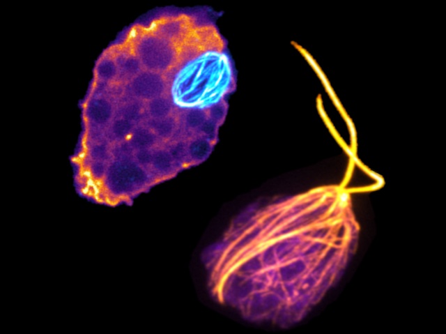 Components clau del citoesquelet de totes les cèl·lules eucariotes, aquelles amb un nucli definit, els microtúbuls estan implicats en molts processos fonamentals, des del transport intracel·lular fins a la divisió cel·lular. Aquests filaments estan formats per proteïnes conegudes com tubulines, que solen ser multifuncionals. No obstant això, l'ameba Naegleri gruberi, un eucariota unicel·lular amb una relació llunyana amb animals i fongs, té diferents i evolutivament distints conjunts de tubulines que realitzen tasques específiques. Algunes formen el citoesquelet quan l'ameba que està reptant passa a una forma de natació, amb un flagel (a la dreta, en groc), mentre que d'altres, més divergents d'altres tubulines eucariotes, formen el seu fus mitòtic (a l'esquerra, en blau), separant els cromosomes durant la divisió cel·lular. A més d'il·luminar l'evolució de l'antiga vida eucariota, l'estudi d'aquestes tubulines podria ajudar a abordar un problema més immediat: les tubulines mitòtiques distintives de N. gruberi es conserven a l'ameba estretament relacionada N. fowleri, que causa greus infeccions del cervell, cosa que les convertix en objectius útils per a possibles tractaments.