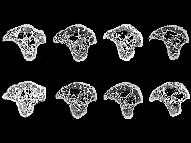 Les genives i la masticació dolorosa són signes de la presència de P. gingivalis. Aquest bacteri és el principal culpable de la periodontitis, la qual és un factor de risc per a una altra malaltia, l’artritis reumatoide (AR). Els pacients amb AR són propensos a fracturar-se els ossos i, a més, encara que aquests lluiten per regenerar-se, tarden més a recuperar-se. Els investigadors han estat investigant si P. gingivalis altera la regeneració òssia en l'AR mitjançant un model ratolí amb la malaltia. La investigació va consistir en danyar els ossos de les potes de ratolins sans i amb AR; la meitat havien sigut infectats per via oral de P.gingivalis. La densitat dels ossos de les potes, la qual és un reflex de la regeneració òssia, va ser mesurada utilitzant microCT (com mostra la imatge) 2 i 4 setmanes després (superior i inferior, respectivament). P.gingivalis i AR reduïen, cadascuna per separat, la regeneració òssia (segona i tercera columna) en comparació amb la regeneració dels ossos dels ratolins sans (primera columna), però ambdues conjuntament, milloraren aquest efecte (quarta columna). Per tant, els tractaments de la periodontitis poden ser útils per ajudar als pacients amb AR a recuperar-se més ràpidament de les fractures òssies.