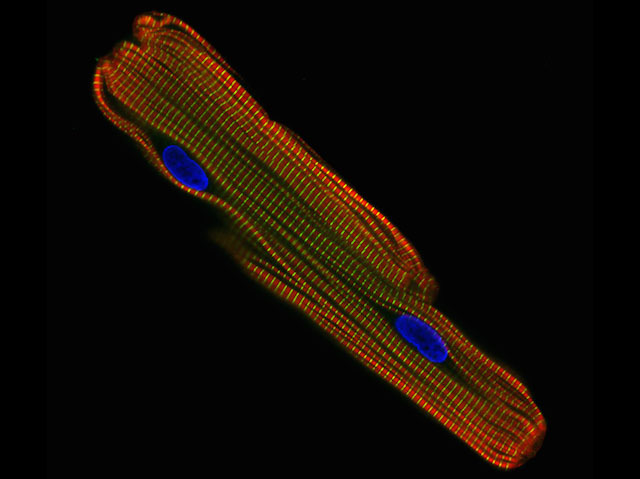Mentre que els músculs dels teus braços i cames poden acabar cansats o adolorits després de fer exercici al gimnàs, d'una ràpida caminada o d'un poc de jardineria energètica, les cèl·lules musculars deu teu cor (dues de les quals es veuen ací sota un microscopi d'alta potència) no tenen aquesta opció. Han d'estar bombant 24 hores al dia, arribant a fer al voltant de 2500 milions de batecs en una vida. A diferència de les cèl·lules del múscul esquelètic del cos, les quals són molt llargues i primes, les cèl·lules musculars (cardíaques) del cor són més curtes i en forma de Y, entrellaçant-se totes juntes i mantenint un contacte molt pròxim de manera que es menegen com si foren una. Hi ha altra diferència important: una vegada s'han contret, espentant la sang fora del cor, les cèl·lules del múscul cardíac prenen un temps relativament llarg per a preparar-se per a un nou batec. Açò vol dir que no poden mantenir-se en contracció , a diferència del múscul esquelètic, el qual pot aguantar una posició durant molt de temps, mantenint el cor bategant regularment.