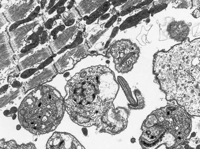 La malaltia de Chagas és una de les malalties tropicals més comuns del món. Està causada per un petit paràsit anomenat Trypanosoma cruzi el qual pren la seua residència en el cor i els músculs de l'estómac, i com es mostra ací (les esferes) sota un microscopi electrònic d'alta resolució infectant les cèl·lules del cor. El paràsit pot causar grans problemes de salud per molts anys, i per ara no hi ha una prevenció efectiva per lluitar contra la infecció. Açò podria canviar gràcies al desenvolupament d'una nova i potent vacuna que activa el sistema immunitari per reconèixer i destruir al Trypanosoma mitjançant un doble atac. Primer ve una injecció d'ADN que codifica dues molècules de proteïnes específiques del paràsit, seguida tres setmanes després per una punxada amplificadora que conté les proteïnes en sí. En assajos en ratolins, la vacuna sembla que està tenint un efecte positiu, ajudant al sistema immunitari a mantindre el nombre de paràsits sota control i permetent així poder lluitar contra la infecció.