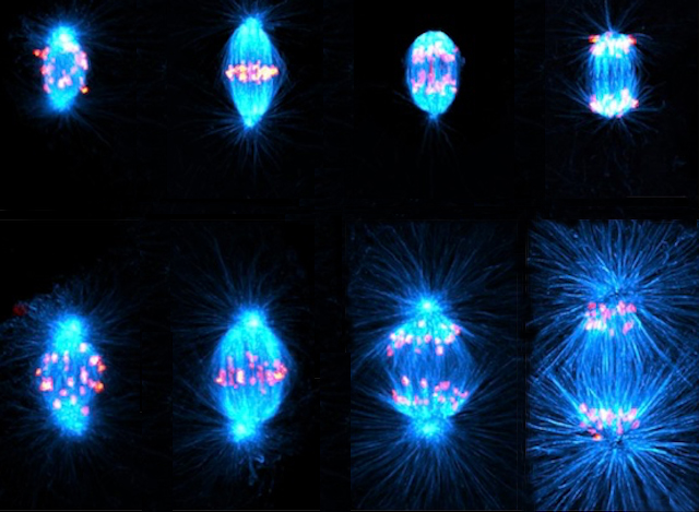 Fins i tot abans de la fecundació, hi ha molts processos molt acurats que permeten que les primeres cèl·lules de l’òvul, o oòcits, maduren. Ací veiem els cromosomes d’ADN (destacats en roig) dins de dos oòcits d’estrella de mar intentant dividir-se mitjançant meiosi. Normalment, les fibres del fus (en blau) separen la cèl·lula i l’ADN en dues estructures de mides diferents. Mentre que el cos polar més petit es recicla, la més gran esdevé l’òvul madur, mantenint la major part del citoplasma i les molècules nutritives que contenia l’oòcit original. En la cèl·lula inferior, però, àsters més grans de fibres del fus fan que la divisió sigui més simètrica, similar a com es dividix un òvul fecundat. Els investigadors van bloquejar un conjunt important de proteïnes relacionades, la via Mos–MAPK, en aquest oòcit, i suggerixen que MAPK podria actuar com un interruptor entre divisió asimètrica i simètrica, aportant pistes sobre mecanismes similars en la fertilitat humana.