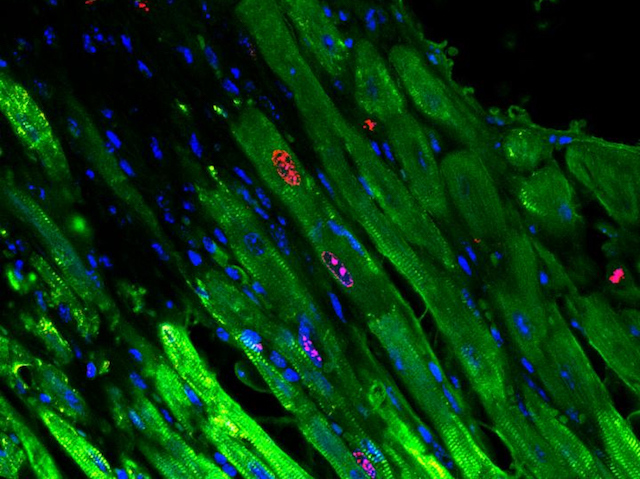 Com que les cèl·lules cardíaques adultes no tenen quasi capacitat per replicar-se, el múscul danyat per un atac al cor és, en gran mesura, irreparable, cosa que causa una debilitat al cor de per vida. S’ha demostrat, en ratolins, que certs microARNs, xicotetes molècules que regulen gens, afavoreixen la replicació de les cèl·lules cardíaques i milloren la seua funció. No obstant això, aquests ARNs es degraden ràpidament després d’injectar-los, així que es necessiten tractaments repetitius perquè siguen efectius. Per matindre la seua funció més temps, els científics han fabricat un nou hidrogel (una mescla de polímers i aigua) que conté microARNs i que actua com un líquid mentre passa a través de l’agulla de la xeringa però retorna al seu estat de gel, més rígid, una volta injectat al cor. Així, els microARNs queden enganxats al seu lloc, protegits pel gel i són alliberats lentament a mesura que el gel es degrada. En realitat, una única injecció ha mantingut la replicació de les cèl·lules cardíaques (punts rojos) en ratolins durant dos setmanes i ha millorat la funció cardíaca en un mes.