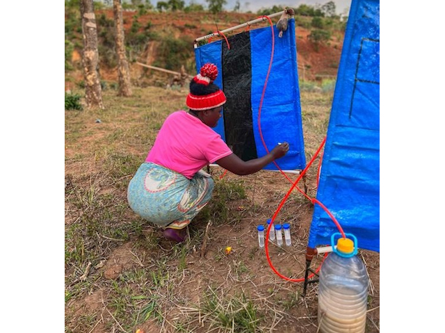 La ceguesa dels rius, que es caracteritza per picors i erupcions a la pell així com per pèrdua de visió, està causada pel cuc parasitari Onchocerca volvulus, transmès als humans mitjançant la picada de les mosques negres. La malaltia és un problema important de salut pública a zones tropicals d’Àfrica, i per controlar-ne la prevalença o estudiar-ne la transmissió, els científics necessiten capturar aquestes mosques. La foto mostra un nou aparell que s’està provant amb aquest propòsit. Setze versions d’aquesta trampa es van provar a Ghana, Costa d’Ivori, Malawi i Moçambic. Totes oferien dos elements irresistibles per a les mosques: diòxid de carboni i olor de suor humana (sigui orgànica o sintètica). Les versions que combinaven diòxid de carboni produït per llevat amb calcetins prèviament utilitzats van ser les més eficaces. Fins ara, l’única tècnica recomanada consistia a utilitzar una persona asseguda al costat d’un riu com a esquer. La combinació llevat–calcetins és, per tant, una opció barata, pràctica i, a més, molt més segura.