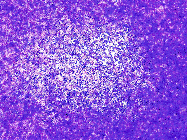 Encara que la infecció del virus Zika normalment no produeix símptomes, és un problema per a les dones embarassades. El virus causa seriosos defectes de naixement com microcefàlia, on el bebé naix amb un crani i cervell inusualment petits. Els científics han descobert que les femelles de ratolí infectades pel virus Zika abans de quedar-se embarassades, tenen menys probabilitat de tornar a quedar infectades durant l’embaràs, gràcies a la presència d'anticossos protectors produïts pel seu sistema immunitari, encara que no hagen presentat símptomes durant la primera infecció. Aquesta imatge mostra una de les proves que els investigadors utilitzen per descobrir com d'infecciós és el virus i mesurar la protecció dels anticossos: la taca propra són cèl·lules de renyó de mico crescudes al laboratori, mentre que les taques blanques són àrees que han sigut destruïdes per la infecció del virus Zika. Aquest descobriment podria conduir a obtindre millors proves i consells per a les dones embarassades que viuen en àrees on el Zika és comú.