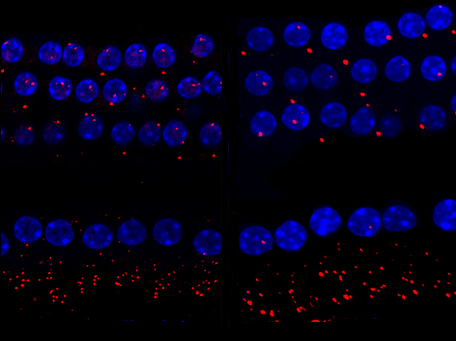 Per què alguna gent perd l’oïda amb l’edat, mentre que altres tenen un oït molt fí? Una causa d’aquesta pèrdua és problemes amb les delicades cèl·lules ciliades que estan dins d’una estructura que sembla una closca dins l’orella, coneguda com la còclea, que respon al soroll. Per entendre què ocorre quan es produix la pèrdua d’oïda, els científics han estat estudiant les cèl·lules ciliades coclears en ratolins amb una mutació en el gen anomenat Neuropilina-1 (a la part dreta de la imatge), que també perden l’oïda amb l’edat, i comparant-los amb cèl·lules d’animals no afectats (a l'esquerra). l'ADN dins de les cèl·lules ciliades està tenyit de blau, mentre que les connexions neuronals estan ressaltades com a punts rojos. Tot i que la diferencia és prou subtil, hi ha menys punts rojos al voltant de la capa externa de les cèl·lules ciliades dels ratolins que els manca la Neuropilina-1, suggerint que el gen està implicat en la connexió d'aquestes cèl·lules al sistema nerviós i en la transmissió de la informació del so al cervell.