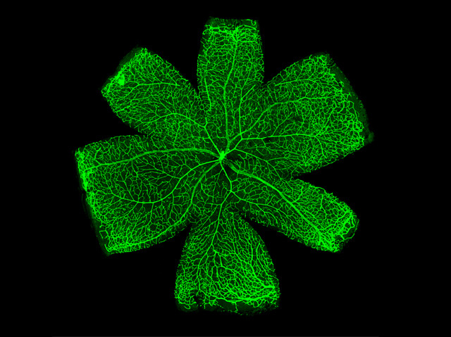¿Són açò les venes d'una fulla? O, ¿potser és un mapa estrany? De fet, és la delicada xarxa de vasos sanguinis a la capa sensible a la llum de la part posterior del globus ocular del ratolí, coneguda com a retina, acolorida artificialment i observada amb un microscopi. La retina està plena de cèl·lules que detecten la llum i de neurones que envien senyals al cervell dient-li què és el que l'animal està veient i totes aquestes cèl·lules necessiten gran quantitat d'oxigen i nutrients de la sang. Els investigadors estan estudiant com creixen aquests tubs fràgils per tal de comprendre millor el que pot passar si hi ha problemes amb el cor o amb la circulació sanguínia. Per exemple, la pressió arterial alta pot causar danys o petits coàguls sanguinis poden quedar atrapats en ells, provocant la pèrdua de visió.